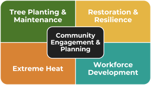 GreenLatinos works closely with community-based organizations (CBOs) and municipalities in historically underrepresented communities via frontline, grassroots efforts to promote public private partnerships to more effectively address tree equity, heat mitigation, restoration and resilience and urban forestry workforce development.
